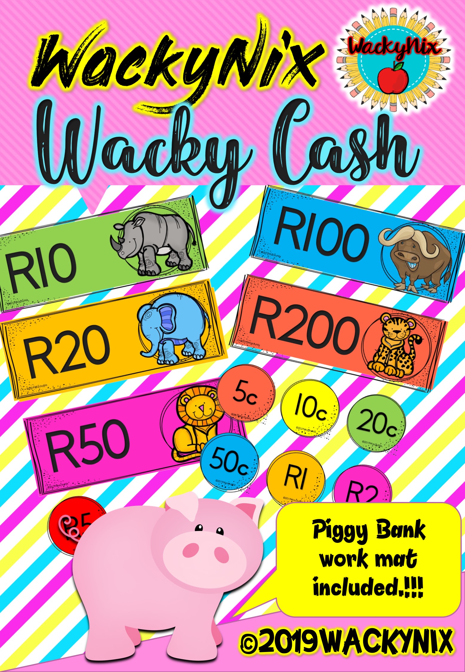 The WackyCash was created for South African educators to help teach and practice using money. The animals on the cash correspond with South African money. A piggy bank work mat is included and can be used in different ways.